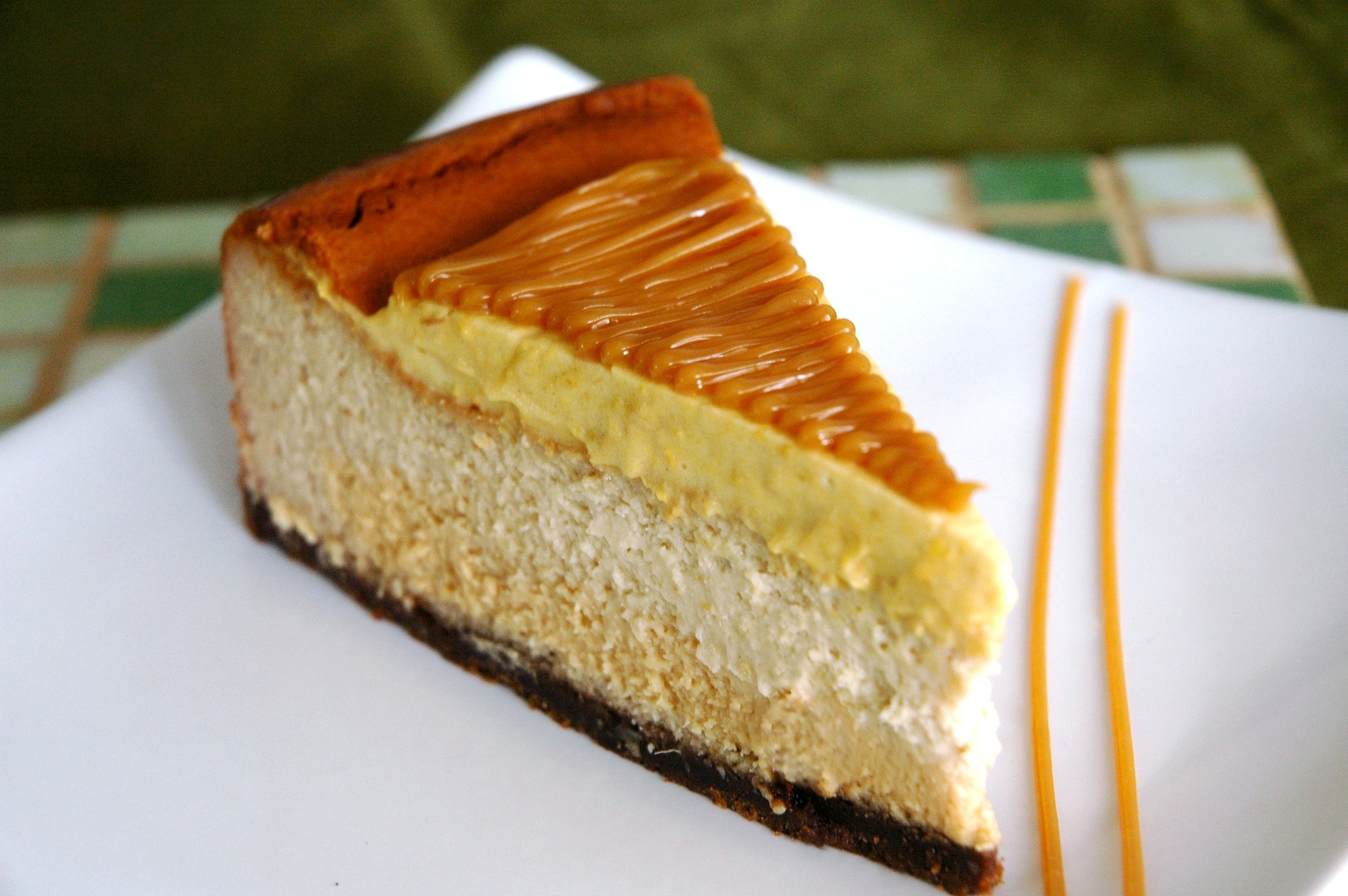 Base de galleta de vainilla, relleno de cremoso cheesecake tradicional mezclado con puré de lúcuma y manjar, cubierto con crema de lúcuma y decorado con rayitas de manjar.