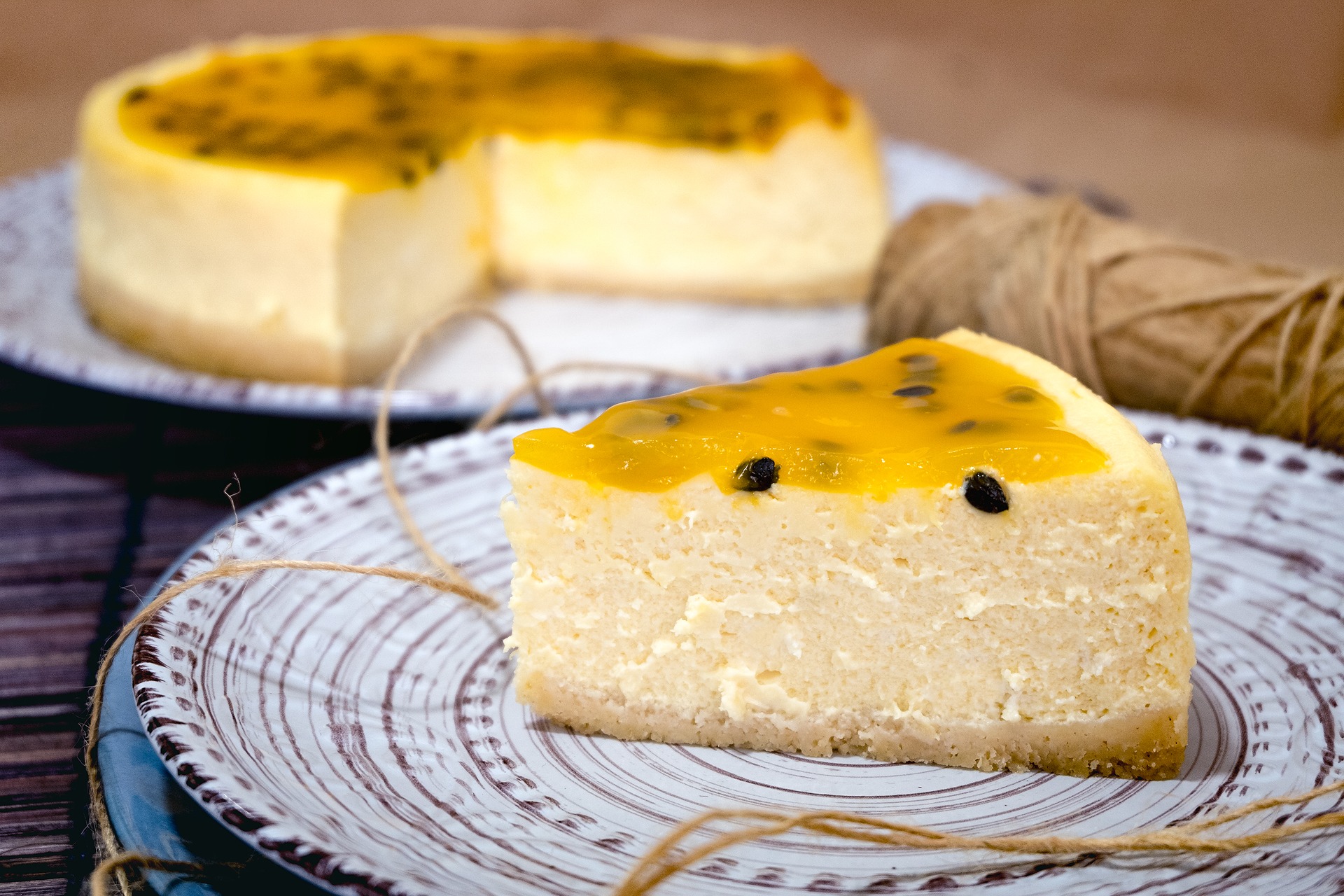 Base de galleta de vainilla, relleno de cremoso cheesecake tradicional mezclado con maracuyá, cubierto con salsa de maracuyá con pepas.