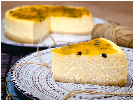 Base de galleta sin azúcar, relleno de cremoso cheesecake tradicional sin azúcar, cubierto con salsa de maracuyá con pepas sin azúcar. Endulzado con maltitol.